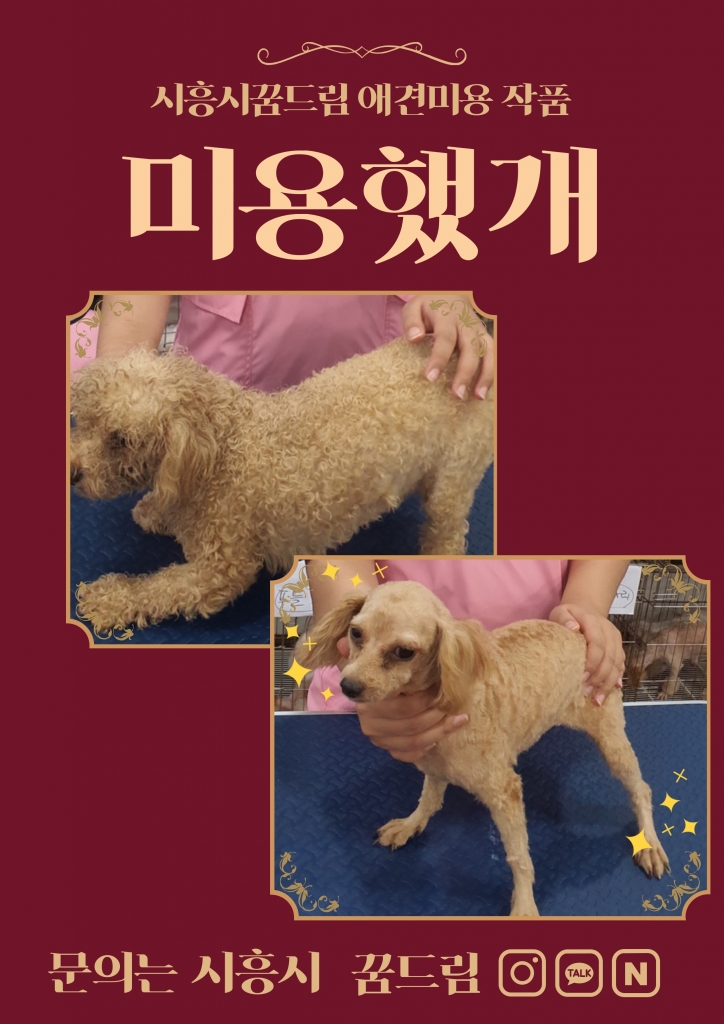 • 내일이룸학교 애견미용 과정을 배우며 복슬복슬했던 푸들을 깔끔하게 미용한 애견미용 작품입니다.